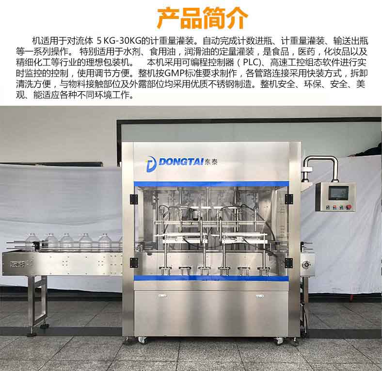 本機適用于對流體5kg-30kg的計重量灌裝。自動完成計數進瓶、計重量灌裝、輸送出瓶等一系列操作。 特別適用于水劑、食用油,潤滑油的定量灌裝,是食品,醫藥,化妝品以及精細化工等行業的包裝機。本機采用可編程控制器(PLC)、高速工控組態軟件進行實時監控的控制,使用調節方便。整機按GMP標準要求制作,各管路連接采用快裝方式,拆卸清洗方便,與物料接觸部位及外露部位均采用優質不銹鋼制造。整機安全、環保、安全、美觀、能適應各種不同環境工作。