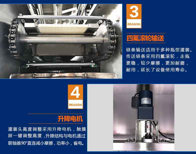 2、鏈條輸送適用于多種瓶型灌裝。傳送鏈條采用四氟滾輪,走瓶更穩,較少摩擦,更加耐磨,耐用,延長了設備使用壽命。增加卡瓶口裝置:方便瓶口小的容器灌裝,灌裝頭和瓶口的定位更準確;采用O型擋板,屏蔽漲緊輪的弊端(采用魚眼調節鏈輪的松緊度),輸送采用四氟滾輪式,容器輸送更平穩,可正反轉輸送;