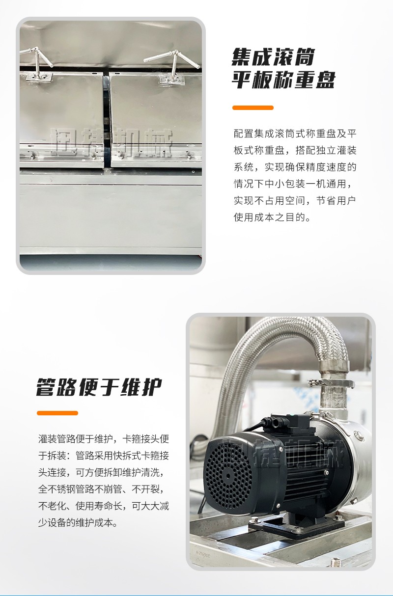 集成滾筒、平板稱重盤,一機多用,方便快捷:配置集成滾筒式稱重盤及平板式稱重盤,搭配獨立灌裝系統,實現確保精度速度的情況下中小包裝一機通用,實現不占用空間,節省用戶使用成本之目的。