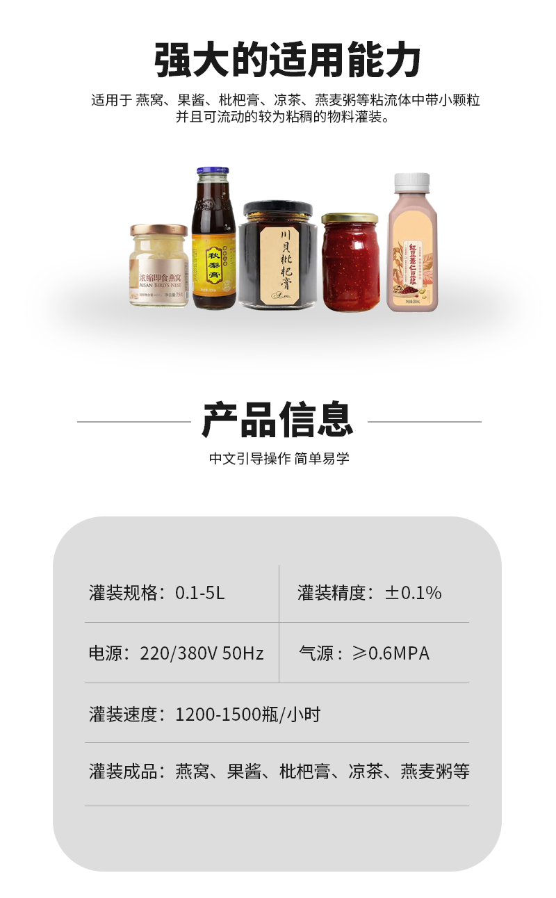 六頭柱塞灌裝生產(chǎn)線適用于燕窩、果醬、枇杷膏、涼茶、燕麥粥等粘流體中帶小顆粒并且可流動的較為粘稠的物料灌裝。