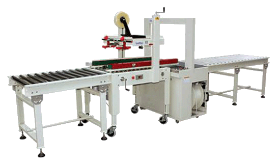 封箱機(紙箱膠帶封口)+高解析噴碼機(日期、批號、廠名等信息噴印打碼設備)+自動打包機(自動打出兩道PP帶。進行紙箱捆扎包裝)